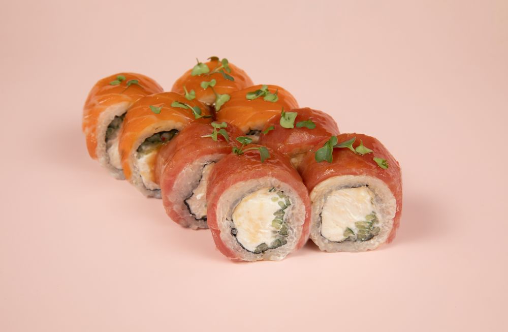 "Нори, рис , творожный сыр , огурец , лосось,\ тунец"