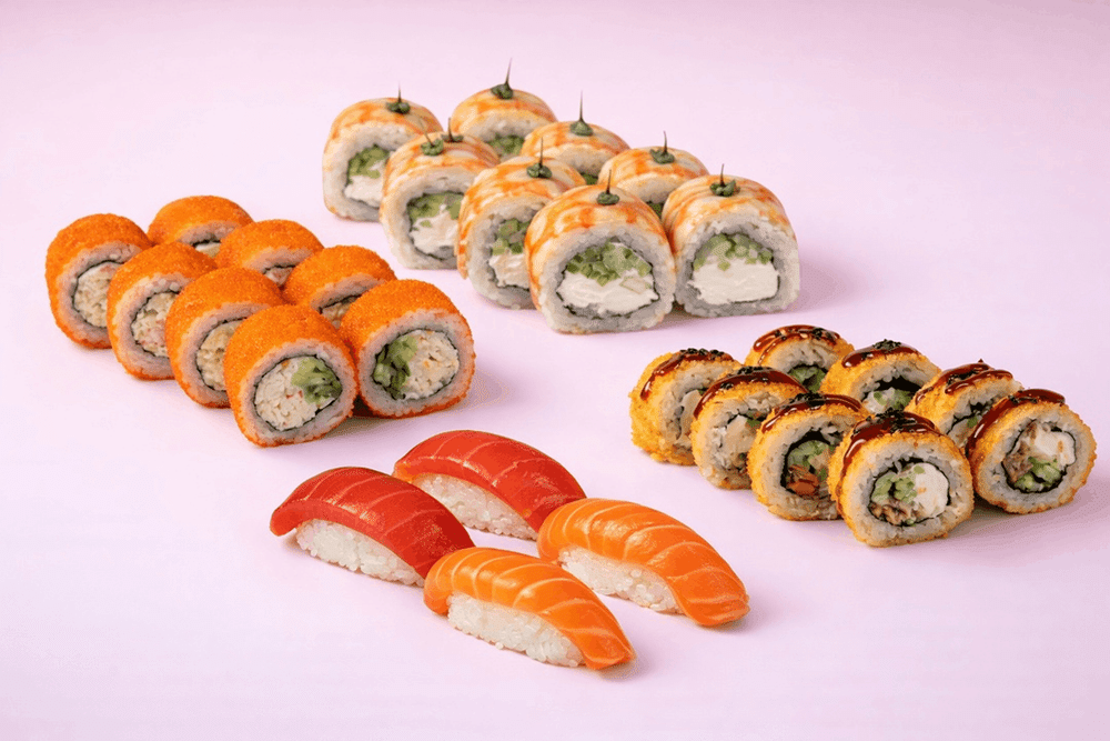 Филадельфия креветка, калифорния краб, тёплый ролл с жареным лососем, суши тунец 2 шт, суши лосось 2шт